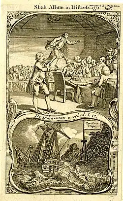 Colebrooke was a full-time director of the East India Company from 1767 to 1771, deputy chairman from 1768 to 1769 and was elected chairman three times, in 1769, 1770 and 1772.[4] His final year in office was a disastrous one: the company got into financial difficulties (which led to the passing of the Regulating Act 1773), he was accused of speculating in its stock while chairman, and was left heavily in debt to a number of the other leading figures in the company, partly through arrangements to procure votes in the company's elections. (In 1771 he, Sir William Pulteney and Sir James Cockburn recruited Paul Wentworth (spy) borrowed £66,000 together from Hope & Co.[4]) He lost much larger sums, however, speculating on raw materials - hemp, flax, lead, logwood and alum, and the fall or rises of the market value of EIC-stocks. In 1771 he lost £190,000 dealing in hemp; from 1772 he was attempting to corner the world's supply of alum, buying up mines in Yorkshire and Lancashire, and saw much of the remainder of his fortune swallowed up when the market collapsed as part of the financial crisis of 1772.[9]