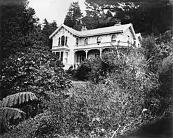 George and Elizabeth Denton raised 11 children in their house called Fernhill in Woolcombe Street (324 The Terrace) opposite the top of Ghuznee Street. The 1-acre (0.40 ha) property backed onto the Town Belt.[5] He grew nīkau there and gave away their carefully cultivated seedlings.[6] Denton's hatchery near his house distributed some 5000 to 6000 hatchling trout around the lower North Island each year. A founder and stalwart of the Wellington Acclimatisation Society he also acclimatised and distributed the society's imported birds and maintained any maimed birds all in his own aviary.[3] At the Acclimatisation Society he was assisted by Alexander Rutherfurd (1852–1931), 30 years an assistant and clerk assistant of the House of Representatives, of Masterton and Moroa Station, Alfredton.[7]
