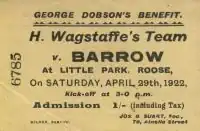 George Dobson's Testimonial match at Barrow took place against a Harold Wagstaff Select XIII team at Little Park, Roose, Barrow-in-Furness on Saturday 29 April 1922.