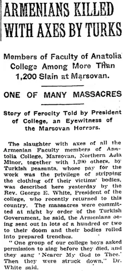 - ^ a b c d e f g h i j "Armenians Killed with Axes by Turks". New York Times Current History Edition: "The European War". 13. 1917.