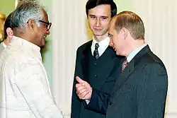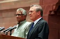 George Mathew Fernandes[1] (3 June 1930 – 29 January 2019) was an Indian politician, trade unionist, statesman,[2] and journalist,[3] who served as the Defence Minister of India from 1998 until 2004. A veteran socialist, he was a member of the Lok Sabha for over 30 years, starting from Bombay (present-day Mumbai) in 1967 till 2009 mostly representing constituencies from Bihar.[4] He was the leader of the Samyukta Socialist Party and the Socialist Party, a key member of the Janata Party, the Janata Party (Secular) and the Janata Dal, and, finally, the founder of the Samata Party.[5][6][7] Holding several prominent ministerial portfolios during his career, including communication, industry, railways, and defence,[8] he was posthumously awarded the Padma Vibhushan, India's second highest civilian award, in 2020.[9][10][11][12]