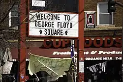 As a reaction to the murder of George Floyd on May 25, 2020, racial justice activists and some residents of the Powderhorn community in Minneapolis staged an occupation protest at the intersection of East 38th Street and Chicago Avenue with a blockade of the streetway lasting over a year.[5][6][7] The intersection is where Derek Chauvin, a white police officer with the Minneapolis Police Department, murdered George Floyd, an unarmed 46-year-old Black man.[8] Activists erected barricades to block vehicular traffic and transformed the intersection and surrounding structures with amenities, social services, and public art depicting Floyd and other racial justice themes.[2][9][7] The community called the unofficial memorial and protest zone at the intersection "George Floyd Square". The controversial[10] street occupation in 2020 and 2021 was described as an "autonomous zone" and a "no-go" place for police,[11] but local officials disputed the extent of such characterizations.[12][13]
