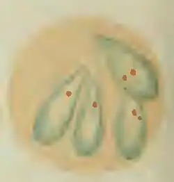 Nuttall began working on ticks and tick-transmitted diseases in 1904.[1] His first studies were with canine piroplasmosis. Piroplasmosis, or babesiosis, unknown in Britain, is a malaria-like disease caused by a protozoan parasite. At one stage in its life-cycle the parasite is pyriform (pear-shaped), hence the name piroplasmosis.[36] It affects a wide variety of wild and domestic animals. Human cases occur, but are uncommon. Smith and Kilborne identified the parasite in Texas cattle fever, and established that it was transmitted by ticks, the first proven case of arthropod disease transmission.[37][38] In a series of papers published with Graham-Smith in The Journal of Hygiene (1904–1907) Nuttall described the nature of the disease and the multiplication of the parasite in the blood of dogs. Subsequent work with Seymour Hadwen led to the discovery that trypan blue was an effective treatment both in dogs and cattle.[39][40][41] This was a finding of great economic importance, and trypan blue became the standard treatment for piroplasmosis/babesiosis for many years.[1][5][42]