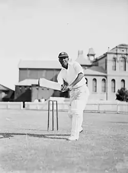 At the beginning of the first Test, West Indies were bowled out 296 as Grimmett took seven wickets, including Headley first ball. In the second innings, with West Indies 80 behind, Grimmett again attacked Headley's leg stump. After having his scoring restricted, Headley lost patience and after scoring 11 was stumped, trying to hit Grimmett. Bowled out for 249, West Indies lost by ten wickets.[9][37] After scoring only three in the following tour match against Tasmania, Headley contributed 14 and two in an innings defeat in the second Test.[9] After two heavy Test defeats for the tourists, some critics believed that the series was too one-sided and that some of the five Tests should be cancelled.[38] Headley's poor run of form continued in the West Indian victory over Queensland and, having put on weight, he was also struggling with his fitness.[9][38] In an effort to overcome Australia's leg stump attack Headley had altered his batting stance; instead of standing at right angles to the bowler, he turned his body more front-on, to enable him to improve his placement of the ball on the leg side.[38] His quick footwork enabled him to alter his position if necessary to play the ball on the off side.[39] He also eliminated from his strokes a risky cover drive he had developed on Caribbean pitches.[40] During the third Test at Brisbane, Headley made his first substantial contribution to the series, after Australia scored 558 batting first. Facing Grimmett's leg side tactics, Headley managed to score freely, and forced Grimmett to alter to an off stump attack. With ten fours in total, Headley became the first West Indian to score a century against Australia, and was left 102 not out when West Indies were bowled out for 193.[9][38][41] Forced to follow-on, West Indies were dismissed for 148 of which Headley made 28, the highest score of the innings. Ironmonger tricked him into playing the leg glance and he was caught by the wicket-keeper who had moved across in anticipation of the shot.[42]