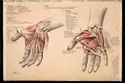 George Viner Ellis (1812-1900) succeeded to the Chair of Anatomy at University College London in 1850, and became one of the foremost anatomists of his time. This institution, in its first thirty-five years of existence, published a large number of anatomical atlases. Ellis and Ford used the relatively new technique of chromolithography for their imperial folio atlas of fifty-eight plates, Illustrations of Dissections in a Series of Original Coloured Plates the Size of Life. The plates were done between 1863 and 1867, with from four to seven completed each year. These plates are considered clear and accurate, with an aesthetic depiction of the cadavers, printed by the Mintern Bros., and published by James Walton.[6]