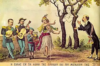 George's silver jubilee in 1888 was celebrated throughout the Hellenic world, and Athens was decorated with garlands for the anniversary of his accession on 30 October.[47] Visitors included the Crown Prince of Denmark, the Prince and Princess of Wales, the Duke and Duchess of Edinburgh, Grand Dukes Sergei and Paul of Russia, and Djevad Pasha from the Ottoman Empire, who presented the King with two Arabian horses as gifts.[48] Jubilee events in the week of 30 October included balls, galas, parades, a thanksgiving service at the Metropolitan Cathedral of Athens, and a lunch for 500 invited guests in a blue and white tent on the Acropolis.[49]