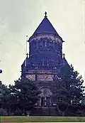 Keller's involvement with the James A. Garfield Memorial in Cleveland began after he submitted an architectural design to the trustees of the Garfield National Memorial Committee. The committee, headed by ex-President Rutherford B. Hayes along with Jeptha H. Wade, president of Cleveland's Lake View Cemetery, had been formed for the purpose of securing a plan for a memorial to President James A. Garfield following his assassination in 1881. To this end during the autumn of 1883 the committee sponsored a design competition in which Keller took part. The competition promised a prize of $1,000 to the winning design, thus attracting not only American but also European entries. To judge the submissions, the committee obtained the assistance of Boston architect Henry van Brunt and English-born architect Calvert Vaux of New York City.[6] Both van Brunt and Vaux ultimately chose Keller's design, and he was awarded the commission on June 24, 1884. Excavation for the monument at Lake View Cemetery began on October 6, 1885; it was dedicated on Memorial Day, May 30, 1890.[7] Once again, Keller chose Caspar Buberl to execute figural friezes for his design.