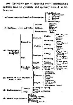 A special feature of the 1857 Handbook, were two classification charts of the organization and the costs of a railroad (see images) given in its last chapter on management. After explaining the duties of employees, the number of trains to be used, and the amount of service of engines, Vose goes into expenses, receipts, and profits. He presents another classification chart of the whole cost of operating and of maintaining a railroad (see image).[15]
