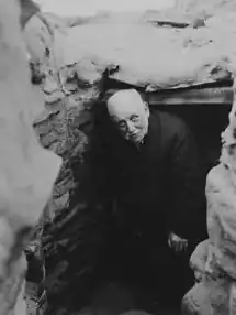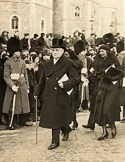 Before the outbreak of the First World War in August 1914, the Herald took a strong anti-war line.[79] Addressing a large demonstration in Trafalgar Square on 2 August 1914, Lansbury blamed the coming conflict on capitalism: "The workers of all countries have no quarrel. They are ... exploited in times of peace and sent out to be massacred in times of war".[80] Lansbury's position was at odds with that of most of the Labour movement, which allied itself with the wartime coalition governments of Asquith and, from 1916, Lloyd George.[n 9] In the prevailing jingoistic mood, numerous readers looked to the Herald—reduced by wartime economies to a weekly format—to present a balanced news perspective, untainted by war fever and chauvinism.[76] During the winter of 1914–15, Lansbury visited the Western Front trenches. He sent eye-witness accounts to the paper, which supported calls for a negotiated peace with Germany in line with President Woodrow Wilson's later "peace note" of January 1917. The paper also gave sympathetic coverage to conscientious objectors, and to Irish and Indian nationalists.[82]