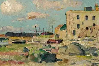 Hunter's landscape style began to change after visits to Etaples in 1913 and 1914, although Hunter did not necessarily appear to be part of the existing Etaples art colony.[15] Here, inspired by French art and the local landscape, he began to develop the style and ability that would later identify him as a colourist.[16] However, with the onset of the First World War Hunter was forced to leave Paris and return to Scotland.[17] Hunter had become an American citizen in 1906 and conscription was not introduced until early 1916. Possibly in response to the government's urging able-bodied men and women to help with the war effort, Hunter moved from Glasgow to his cousin's farm near Larkhall where he worked on the land until the end of the war.[4][18]