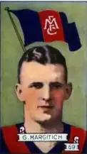 Following Rostrevor, Margitich played for South Australian National Football League (SANFL) club South Adelaide He kicked 74 goals and was selected to tour Western Australia with the state team. Margitich was transferred by his employer (Vacuum Oil) to Victoria. Margitich then debuted for Melbourne in 1930 and kicked 73 goals, a then club record for most goals in a season. He topped their goalkicking again in 1931 and 1932 and managed 10 goals in a game three times in his career. The most he kicked was 12 against North Melbourne in 1931.