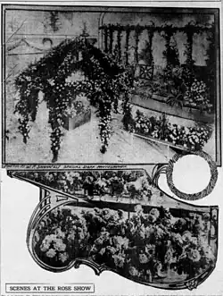 "To hide the big stage which is built in one end of the auditorium, Mr. Otten had erected the frame of an Italian pergola which he covered in smilax and roses. The columns of this rose fully 30 feet from the stage level, and its beauty was most impressive. Festoons of roses and greens draped the railing of the gallery which surrounds the entire hall, and the stairways were banked solidly with them. The immense columns which support the building were thickly twined, and the floor space occupied by innumerable long tables on which the exhibition roses were placed in glass jars. There were 24 amateur exhibitors and a number of professional, and in addition to these many rosarians displayed tables of perfect specimens which were not entered for competition."[15]