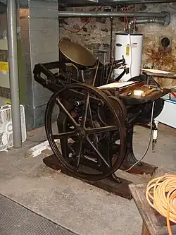 Born in Salem, New Hampshire, where his family had lived for more than one hundred years, he was educated there and at Boston before deciding to become an actor.[1] Failing to achieve a livelihood at this, he moved to New York where he became an apprentice printer. Upon learning the trade, he opened a job printing shop of his own. Around 1835 he began to experiment in press design. His first patent for a job press was granted in 1851. While this press had many flaws, he began to manufacture it as the "Yankee" job press. Subsequently, he introduced the "Turnover" and the "Firefly," which could produce 10,000 printed cards an hour. About 1858 he produced the "Franklin" press, which has ever since been known as the Gordon Jobber. (Gordon claimed that Benjamin Franklin had revealed the basic design of the press to him in a dream.) It was strong, well built, and easy to operate. The Gordon Press solved the problem of clam-shell presses (which previously had "snapped" and endangered pressmen's fingers) by having the platen open on cams, so that it was flat and lagged for the pressman as he fed the sheet, before closing parallel to the type bed.