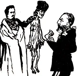 The socialist Eftimiu argued that Furnica's politics were left-of-center, with Ranetti as "a convinced democrat, anti-monarchic, an enemy of those who stood for the bourgeois-landowning society".[29] His pen, Eftimiu claims, "served to castigate racketeering politicians, prejudice, debauchery, fake patriotism, and all the dovetailing high-society that was creaking at the corners."[30] King Carol I himself was ridiculed, and aware of it, but took no measure to suppress Ranetti.[19] On one occasion, Ranetti participated in rendering homage to a Romanian royal, namely the Princess Dowager Marie of Edinburgh. With Cincinat Pavelescu, Radu D. Rosetti, Dimitrie Anghel and Ștefan Octavian Iosif, he co-wrote a poem welcoming her to the Tinerimea Artistică salon of March 1906.[31] Some of Furnica's most noted cartoonists were Tinerimea painters: Ion Theodorescu-Sion, Camil Ressu, Iosif Iser, Francisc Șirato, Nicolae Petrescu Găină, and Ary Murnu—the latter remembered especially for his routine mockery of Ioan Kalinderu, administrator of the crown domains.[29][32] The articles and caricatures were more lenient toward actor Ion Brezeanu, who was the other stock character in Furnica humor.[19][33]