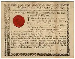 As compensation for his wartime service, Virginia gave Clark a gift of 150,000 acres (610 km2) of land that became known as Clark's Grant in present-day southern Indiana, while the soldiers who fought with Clark also received smaller tracts of land. The grant and his other holdings gave Clark ownership of land that encompassed present-day Clark County, Indiana, and portions of adjoining Floyd and Scott Counties.[59][60] Although Clark had claims to tens of thousands of acres of land, the result of his military service and land speculation, he was "land-poor," meaning that he owned much land but lacked the resources to develop it. Clark's receipts were discovered in the Richmond Virginia's Auditors building in the early twentieth century showing that his record keeping efforts were complete and correct but not reimbursed due to the State of Virginia's incompetency, thus he was exonerated, though not officially. Although the autobiography contains factual inaccuracies, the work includes Clark's perspective on the events of his life. Some historians believe Clark wrote his memoirs in attempt to salvage his damaged reputation and to document his contributions during the Revolutionary War.[34]