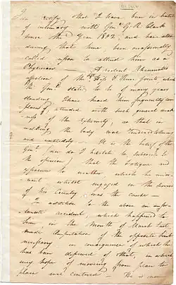 Clark is best known as a war hero of the Revolutionary War in the West, especially as the leader of the secret expeditionary forces that captured Kaskaskia, Cahokia, and Vincennes in 1778–79. Some historians have suggested that the campaign supported American claims to the Northwest Territory during negotiations that resulted in the Treaty of Paris (1783).[15] Clark's Grant, the large tract of land on the north side of the Ohio River that he received as compensation for his military service, included a large portion of Clark County, Indiana, and portions of Floyd and Scott Counties, as well as the present-day site of Clarksville, Indiana, the first American town laid out in the Northwest Territory (in 1784). Clark served as the first chairman of the Clarksville, Indiana, board of trustees.[15][59] Clark was unable to retain title to his landholdings. At the end of his life, he was poor, in ill health, and frequently intoxicated.[80]