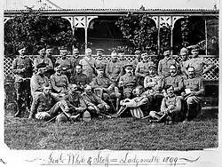 White became commander of the forces in Natal in September 1899[29] at the opening of the Second Boer War and fought at the Battle of Elandslaagte in October 1899.[30] He then withdrew to Ladysmith where he took command of the garrison during the siege of Ladysmith with his aide-de-camp Clive Dixon (later portraying the siege in watercolour): when his position there became untenable he was instructed by General Sir Redvers Buller to destroy the guns and surrender the garrison on the best terms he could. White responded "I hold Ladysmith for the Queen" and held out for another four months before the town was relieved in late February 1900. His health greatly reduced, White left the city in early March to recover in more peaceful parts of the colony, before he left Cape Town for the United Kingdom later the same month.[31] For his service in the war he was appointed a Knight Grand Cross of the Order of St Michael and St George (GCMG) later that year,[32] having earlier been made a Knight Grand Cross of the Royal Victorian Order (GCVO) in May 1900.[33]