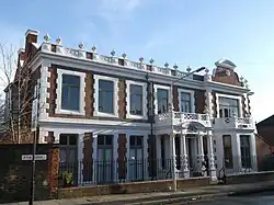 Tutill was most well known for and most accomplished in his banner and regalia manufacturing business.[1] Adverts for the firm, published after his death, claim that he founded it in 1837 aged 19–20.[4] However, the 1838 Hull trade directory does not include such an entry.[2] The company had definitely been established by 1847 and was associated with the address 52 Banner Street, St Luke's in London.[4] At the time, Tutill was living in Aldgate and in the 1851 was described as a "banner supplyer".[5] By 1859, Tutill's business was based at Canonbury, and the following year it had moved to 83 City Road, London where the business would remain until the Second World War.[6] Tutill chose to locate his business in East London partly due to its close proximity to the large Spitalfields and Bethnal Green Huguenot silk-weaving communities.[7][8] Other craftsmen, designers and machinists could also be found nearby.[9] The building on City Road was purpose-built to allow the ideal conditions for artistic creation and manufacturing, such as a glass roof to let in natural light.[10][11]