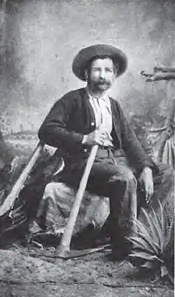 In 1880 pioneer photographer C. S. Fly often visited Bisbee on miners' paydays and he took a photo of Warren. The image was used as a model for the miner posing with long-handled spade on the Seal of Arizona.[2] His pauper's grave, originally only marked by a wooden plank saying "G.W. 24" in the Bisbee-Lowell Evergreen Cemetery was later commemorated by a large monument erected in his honor.