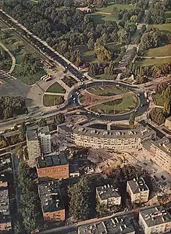 In 1967, modernisation works reduced the central island's size, added funnel-shaped entry lanes, relocated tram stops, installed traffic lights, closed the Jakubowska Street exit, and constructed an underpass beneath Józef Poniatowski Avenue on the western side, opened in 1969.[10][11] In 1968, the Monument of Gratitude to Soviet Army Soldiers was relocated deeper into Skaryszew Park, and associated graves were moved to the Mausoleum Cemetery of the Soviet Soldiers on Żwirki i Wigury Street.[12][13][14]