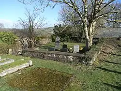 Bampfylde Memorial Garden, North Molton churchyard, in memory of Hon. (Coplestone) John de Grey Warwick Bampfylde (1914–1936), looking eastward to Exmoor. The memorial stone bench to his father the 4th Baron Poltimore sits at the base of the large tree. The roof of an outbuilding of Court House, the Bampfyldes' manor house, is visible behind the garden