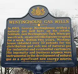 By 1883, Westinghouse had become interested in natural gas. Gas had recently been discovered in nearby Murrysville, Pennsylvania, and it attracted a lot of attention, in part because of a spectacular flaming blowout of the Haymaker Well in 1878. After visiting the well and recognizing its commercial potential, he undertook drilling for gas on his estate Solitude (today's Westinghouse Park) in Pittsburgh.