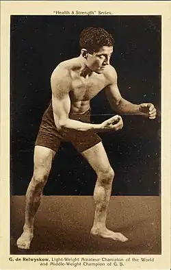 Born in Kensington in 1887, the son of immigrants from the Russian Empire, de Relwyskow took up wrestling as a means of keeping fit while a student in London training as an artist and designer. By 1907, he had won thirty-five open competitions in Great Britain and won the English amateur championships at lightweight and middleweight in 1907 and 1908. Because of his success, he was selected to represent Great Britain in the 1908 Olympics held in London.[2]