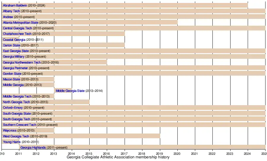 In 2010, All of the existing members of the GJCAA joined the newly organized Georgia Collegiate Athletic Association.