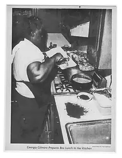 Georgia Gilmore was born in Montgomery County, Alabama on February 5, 1920. She was one of five children born to Janie Gilmore. As a child, she attended a parochial school run by nuns at St. John the Baptist Catholic church.[3] Throughout the course of her life, Gilmore worked as a midwife, a cook, a domestic worker, and she worked on the railroad.[4] She lived in Montgomery with her six children, and during the 1950s, she supported her mother and helped raise her youngest sister and a niece. Known as a kind and motherly woman with incredible cooking skills, Gilmore had a bold personality and resisted the racial injustices common in Alabama during the 1950s. She was also a member of the local NAACP in Montgomery, where she worked with Rosa Parks and other NAACP workers to protest the discriminatory treatment African Americans experienced in Alabama.[5] Before the start of the Montgomery bus boycott, Gilmore decided to stop riding city buses after she and her mother experienced discrimination on the bus.[6] She was not afraid to confront white men and was fiercely protective of her family.[7] Gilmore worked as a cook at the National Lunch Company, a restaurant, in downtown Montgomery in the 1950s.[8]