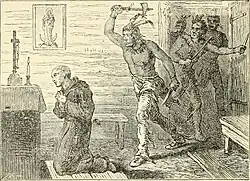 In September of 1597, the Franciscan missionary efforts came to a head. The Catholic opposition to practices of polygamy and divorce was not aligned with the Guale practice. When a baptized Guale man, Juanillo, who was next in line to the Guale chiefdom, attempted marriage to a second wife in Nuestra Señora de Guadalupe de Tolomato, Pedro de Corpa rejected the effort. In response, the Guale Juanillo beheaded Pedro.[2] Later, Father Blas was martyred and Juanillo ordered the chief of St. Catherines Island to kill Miguel and Antonio (Miguel's translator), but he refused and instead asked the friars to go to San Pedro Island. They refused to leave and were killed by Juanillo when he arrived. Later in the month, Francisco was martyred as well.
