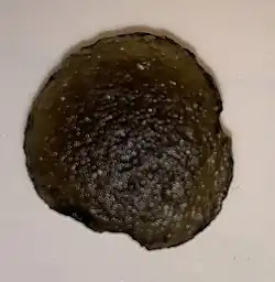 Georgiaite specimens that have been found typically have a round shape and pock marked surfaces caused from the extreme conditions of its formation. Georgiaite most commonly is translucent with an olive green color. The size of Georgiaite can vary but most samples collected average around 2 inches (51 mm) at most.[2] Georgiaite, like other tektites, are silicate glass and most closely resemble obsidian.[1][3] Unlike other North American tektites, Georgiaite contains silica and potassium while showing no traces of any other major elements.[4]