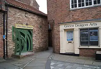 The theatre has a capacity of 200 (standing) and is situated in the 'Cultural Quarter' of Stockton town centre, which is centred on Green Dragon Yard. It is gabled with pantiled roof and approached at the south end from a cobbled passage. There is a lean-to structure at the southern end, which is relatively modern. Adjoining is a cottage which was used as a drawing room, with actors entering the theatre through a door at the stage end of the east wall.[1]