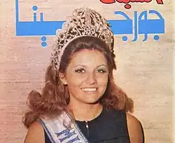 Georgina Rizk (Arabic: جورجينا رزق, romanized: Jūrjīnā Rizq) (born 3 January 1953) is a Lebanese model, socialite and beauty queen. She represented Lebanon and won Miss Universe 1971, making her the first Lebanese woman to win that title and the first Arab winner in the history of the competition. Prior to this, she was crowned Miss Lebanon 1970 and represented Lebanon at the Miss World competition but was unplaced.