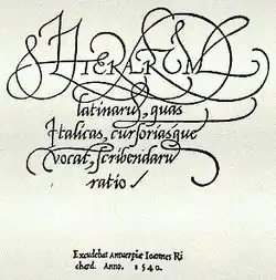 In between these works, he found time to write Literarum latinarum, a small instruction manual on the italic script.[15] The italic script (or chancery cursive) reached the Low Countries from Italy at the beginning of the sixteenth century and it is recorded as a form of typescript in Leuven in 1522.[16] It was much favoured by humanist scholars who enjoyed its elegance and clarity as well as the rapid fluency that could be attained with practice, but it was not employed for formal purposes such as globes, maps and scientific instruments (which typically used Roman capitals or gothic script). Mercator first applied the italic script to the globe of Gemma Frisius and thereafter to all his works, with ever-increasing elegance. The title page of this work is an illustration of the decorative style he developed.[v]