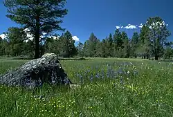 The vegetation in the coniferous forest is dominated by ponderosa pine. Other tree species found in the watershed are lodgepole pine, sugar pine, white fir, and incense cedar. The forest understory include mountain mahogany, big sagebrush, low sagebrush, rabbitbrush, bitterbrush, and manzanita. Other common forest plants include ceanothus, huckleberry, snowberry, blue elderberry, chokecherry, twinberry, and serviceberry. Flowering plants include lupine, vetch, asters, biscuitroot, balsamroot, wild strawberry, yarrow, and dandelion. Grasses found in the forested areas include Idaho fescue, intermediate wheatgrass, bluebunch wheatgrass, bottlebrush squirreltail, and Thurber needlegrass. Invasive species include Kentucky bluegrass and cheatgrass brome. There are also quaking aspen in the upland meadows areas dispersed within the pine forest portion of the watershed.[2][10]