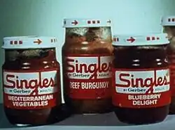 Gerber Singles was a failed product from 1974 by Gerber, a maker of baby food. It was food in glass jars targeted to college students and adults living on their own for the first time.[1] One marketing tag line was "We were good for you then, we're good for you now."[2] According to Business Insider, Gerber believed that there was a market for single serving, ready to eat foods similar to ready-made baby food. Hoping that college students and other adults would purchase such foods if they were not labeled as "baby food", Gerber developed the Singles product. The fatal flaw and the reason the product flopped is that "packages of meat mush didn't exactly scream 'cool' to young singles."[3]