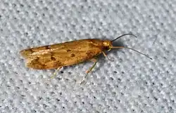 The wingspan is 13–17 mm. The forewings are light yellow, suffused with darker saffron-yellow. The basal half of the costal edge is darkened with black dusting. The hindwings are whitish fuscous.[2] Adults are mainly on wing from June to August.
