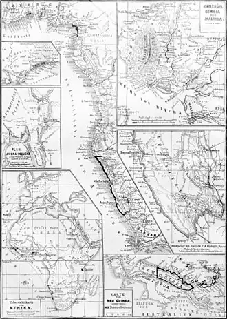 First, Adolf Lüderitz's trading post in the Bay of Angara Pequena ('Lüderitz Bay') and the surrounding hinterland ('Lüderitzland') was placed under the protection of the German Empire in April 1884 as German South West Africa. In July, Togoland and Adolph Woermann's possessions in Cameroon followed, then the northeastern section of New Guinea ('Kaiser-Wilhelmsland') and the neighboring islands ('the Bismarck Archipelago'). In January 1885, the German flag was raised at Kapitaï and Koba on the west African coast. In February, imperialist and "man-of-action" Carl Peters accumulated vast tracts of land for his Society for German Colonization, "emerging from the bush with X-marks [affixed by unlettered tribal chiefs] on documents ... for some 160,000 km2 (60,000 sq mi) of the Zanzibar Sultanate's mainland property."[44] which became German East Africa. Such exploratory missions required security measures that could be solved with small private, armed contingents recruited mainly in the Sudan and usually led by adventurous former military personnel of lower rank. Brutality, hanging and flogging prevailed during these land-grab expeditions under Peters' control as well as others as no-one "held a monopoly in the mistreatment of Africans",[45][46] and in April 1885, the brothers Clemens and Gustav Denhardt acquired Wituland in modern Kenya. With this, the first wave of German colonial acquisitions was largely completed.