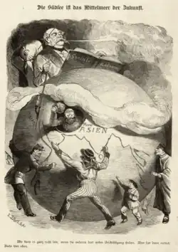 In terms of internal politics, the key aspect is the public pressure which led to the development of a "Colonial fever" (Kolonialfieber) among the German populace. Although the colonial movement was not very strong institutionally, it succeeded in bringing its position into the public debate.[47] A memorandum authored by Adolph Woermann and sent to Bismarck by the Hamburg Chamber of Commerce on 6 July 1883 is considered to have been particularly important in this respect.[48] The approach of the 1884 German federal election and Bismarck's desire to strengthen his own position and bind the National Liberal Party, which supported colonialism, to himself, have also been proposed as domestic factors in the adoption of the colonial policy.[49] Hans-Ulrich Wehler advanced the social imperialism thesis, which holds that the colonial expansion served to "divert" social tensions created by economic crisis to the foreign sphere and helped to reinforce Bismarck's authority.[50] The so-called "Crown-prince thesis" holds that Bismarck was attempting to deliberately worsen the German relationship with the United Kingdom before the anticipated succession of the "anglophile" Frederick III to the German throne in order to prevent him from instituting liberal English-style policies.[51]