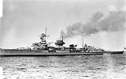 Nürnberg was laid down in 1934 at the Deutsche Werke shipyard in Kiel. She was launched on 6 December 1934 and completed in less than a year, being commissioned on 2 November 1935.[2] The ship thereafter worked up in the Baltic Sea until April 1936, when she joined Köln and Leipzig for a training cruise into the Atlantic.[8] At this time, she was made the flagship of the reconnaissance forces of the German Navy. The three cruisers then returned to the Baltic for additional maneuvers. Nürnberg participated the non-intervention patrols during the Spanish Civil War of 1936–1939. On her initial deployment in 1936, she flew the flag of Konteradmiral Hermann Boehm.[9] Over the course of the conflict, Nürnberg conducted four patrols off Spain, but did not encounter any belligerent forces,[8] with the exception of a claimed attack by an unidentified submarine south of the Balearic Islands on 16 July 1937.[9]