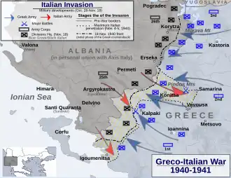 At the outbreak of World War II, Ioannis Metaxas—the fascist-style dictator of Greece and former general—sought to maintain a position of neutrality. Greece was subject to increasing pressure from Italy, culminating in the Italian submarine Delfino sinking the cruiser Elli on 15 August 1940.[19] Italian leader Benito Mussolini was irritated that Nazi leader Adolf Hitler had not consulted him on his war policy and wished to establish his independence.[b] He hoped to match German military success by taking Greece, which he regarded as an easy opponent.[20][21] On 15 October 1940, Mussolini and his closest advisers finalised their decision.[c] In the early hours of 28 October, Italian Ambassador Emanuele Grazzi presented Metaxas with a three-hour ultimatum, demanding free passage for troops to occupy unspecified "strategic sites" within Greek territory.[22] Metaxas rejected the ultimatum (the refusal is commemorated as Greek national holiday Ohi Day) but even before it expired, Italian troops had invaded Greece through Albania.[d] The principal Italian thrust was directed toward Epirus. Hostilities with the Greek army began at the Battle of Elaia–Kalamas, where they failed to break the defensive line and were forced to halt.[23] Within three weeks, the Greek army launched a counter-offensive, during which it marched into Albanian territory, capturing significant cities such as Korça and Sarandë.[24] Neither a change in Italian command nor the arrival of substantial reinforcements improved the position of the Italian army.[25] On 13 February, General Papagos, the Commander-in-Chief of the Greek army, opened a new offensive, aiming to take Tepelenë and the port of Vlorë with British air support but the Greek divisions encountered stiff resistance, stalling the offensive that practically destroyed the Cretan 5th Division.[26]