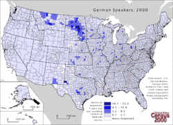 Over 50 million Americans claim German ancestry, which made them the largest single claimed ancestry group in the United States until 2020. As of 2023, 858,682 people in the United States speak the German language at home.[1] It is the second most spoken language in North Dakota (1.39% of its population)[6] and is the third most spoken language in 16 other states.[7]
