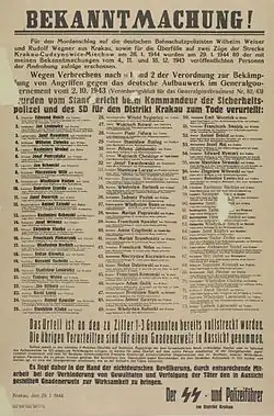 After the launch of "Aktion Reinhardt" Jews escaped from the liquidated ghettos or from transports to death camps. This led the German authorities to issue another series of orders reminding the Polish population of the death penalty for trying to help Jewish refugees.[17] In this context, one can mention, among others, the announcement of SS Commander and Police Commander of the Warsaw district SS-Oberführer Ferdinand von Sammern-Frankenegg of 5 September 1942 and the announcement of the district chief administrative officer of Przemyśl County Dr Heinischa of July 27, 1942, police decree of the Starosta of Sanok County, Dr Class of 14 September 1942, announcement of the City Starosta in Częstochowa E. Franke of September 24, 1942,[12] order of the Starosta of the Kraśnik County of October 23, 1942,[14] and the announcement of the Starosta of the Dębica County Schlüter of November 19, 1942. On September 21, 1942, SS-Standartenführer Herbert Böttcher, SS and Police Leader of the Radom District, issued a circular to the local administrative and police authorities, which contained the following provisions:[1][12]