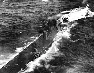 The submarine had a maximum surface speed of 18.3 knots (33.9 km/h; 21.1 mph) and a maximum submerged speed of 7.3 knots (13.5 km/h; 8.4 mph).[6] When submerged, the boat could operate for 63 nautical miles (117 km; 72 mi) at 4 knots (7.4 km/h; 4.6 mph); when surfaced, she could travel 13,450 nautical miles (24,910 km; 15,480 mi) at 10 knots (19 km/h; 12 mph). U-174 was fitted with six 53.3 cm (21 in) torpedo tubes (four fitted at the bow and two at the stern), 22 torpedoes, one 10.5 cm (4.13 in) SK C/32 naval gun, 180 rounds, and a 3.7 cm (1.5 in) SK C/30 as well as a 2 cm (0.79 in) C/30 anti-aircraft gun. The boat had a complement of forty-eight.[6][7]