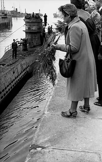 ![]() U-455 arriving in St. Nazaire after her third patrol on 16 June 1942