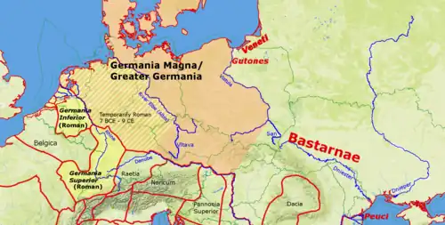 The boundaries of Germania are not clearly defined, particularly at its northern and eastern fringes.[7] Magna Germania stretched approximately from the Rhine in the west to beyond the Vistula river in the east, and from the Danube in the south and northwards along the North and Baltic seas, including Scandinavia.[8][9][10][11] Germania Superior encompassed parts of modern-day Switzerland, southwest Germany and eastern France, while Germania Inferior encompassed much of modern-day Belgium and Netherlands.[7]