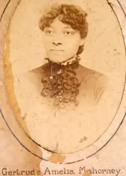 Born in Indianapolis, Indiana about 1863,[9][10] Gertrude Mahorney was the daughter of John Todd Mahorney (1829–1890) and Ann Elizabeth Gray Mahorney (c. 1834 – 1904).[11][12] Her parents owned an ornamental hair (wig) business on Illinois Street near the prestigious Bates House and were active in the antislavery National Negro Convention movement. John Mahorney entered the real estate business,[13] was an author[14] and was the first African-American in Marion County to become active in local Democratic politics.[15][16] He was active in the labor movement, organizing the first African-American Knights of Labor assembly in Indianapolis. Gertrude was raised in the household with her step-grandmother, Johanna Gray, a Prussian and German speaker so that Gertrude became proficient in German.[17]