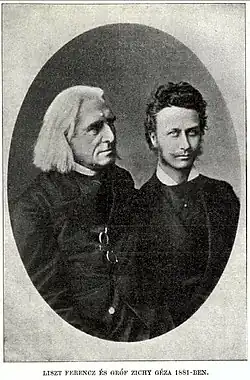 Zichy was born in Sztára Castle in 1849. He came from a noble family and held the title Count Vasony-Keö.[4] Zichy lost his right arm in a hunting accident at age 14 or 15. Instead of despair, he doubled his strive, to form himself into a true piano virtuoso. “I closed the door,” he says in his memoirs, “and got dressed alone. The door handle, the furniture, my legs, my teeth all helped. At lunch, I did not eat any food that I could not cut myself and did not accept the slightest service. Today I peel apples, cut my nails myself, dress alone, ride, drive four-in-hand, I am a good hunter with bullets and buckshot, and I even learned to play the piano a bit. You can be independent with one hand, you just have to know how."[5] So, he persevered by writing and performing piano music for the left hand. In 1873 he began six years of study with Franz Liszt. He also studied under Robert Volkmann.[3]