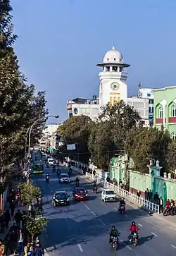 The Ghanta Ghar (घन्टाघर), situated in the capital city of Kathmandu, is the oldest clock tower of Nepal. It lies in front of Rani Pokhari and near Trichandra College. It was built by Rana Prime Minister Bir Shumsher. The original clock tower was designed after Big Ben of London, as Western influence crept into Nepalese architecture during the Rana era. The GhantaGhar that stands today was rebuilt after the 1990 BS earthquake, standing on the site of the original after the old tower was destroyed by the earthquake.[1][2][3]
