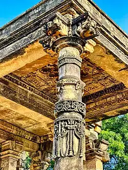 The surviving pillars feature a chain-and-bell (ghanti) motif, after which the temple is now known. The door lintel of the mandapa features Adinatha's yakshini attendant Chakreshvari. She is depicted as having eight arms and sitting on a garuda. The architrave on the doorway features carvings of six auspicious symbols said to have been dreamt by Mahavira's pregnant mother.[3]